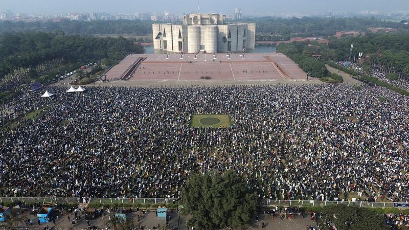 2025年12月31日,人們在孟加拉國首都達卡的國會大廈附近參加卡莉達·齊亞的葬禮(無人機照片)。