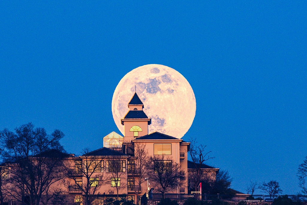 1月3日,江蘇省南京市,今年首個超級月亮亮相天宇。圖中為超級月亮與中國科學院紫金山天文臺田家炳樓同框(多張堆棧)。
