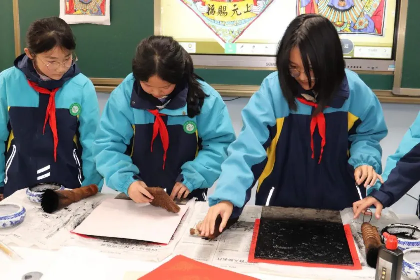 ▲11月,三間“徐悲鴻美育教室”在陜西交付,同學(xué)們在教室中體驗?zāi)景婺戤?/p>