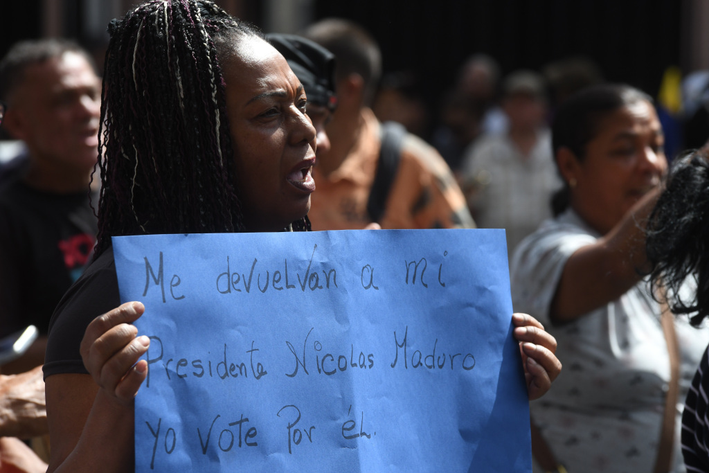 1月3日,一名抗議者手舉標語在委內(nèi)瑞拉首都加拉加斯參加抗議活動。
