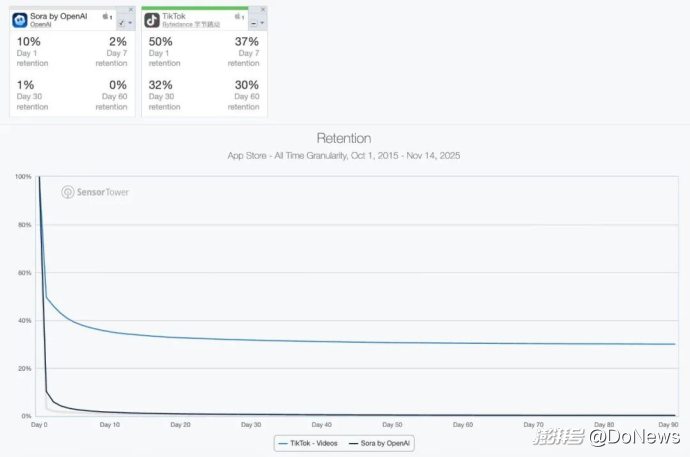 今年9月推出的Sora社交應(yīng)用早期雖然注冊(cè)火爆,但用戶留存狀況堪憂——據(jù)第三方數(shù)據(jù)平臺(tái)Sensor Tower數(shù)據(jù),其上線30天用戶留存率僅1%,60天留存率已接近0%。在此背景下,與迪士尼的合作不僅帶來(lái)資本注入,更關(guān)鍵的是獲得了全球最頂級(jí)的IP資源授權(quán),為Sora生態(tài)提供了高質(zhì)量、合規(guī)的創(chuàng)作素材,顯著增強(qiáng)了其在與谷歌、Meta及中國(guó)AI公司競(jìng)爭(zhēng)中的差異化優(yōu)勢(shì)。