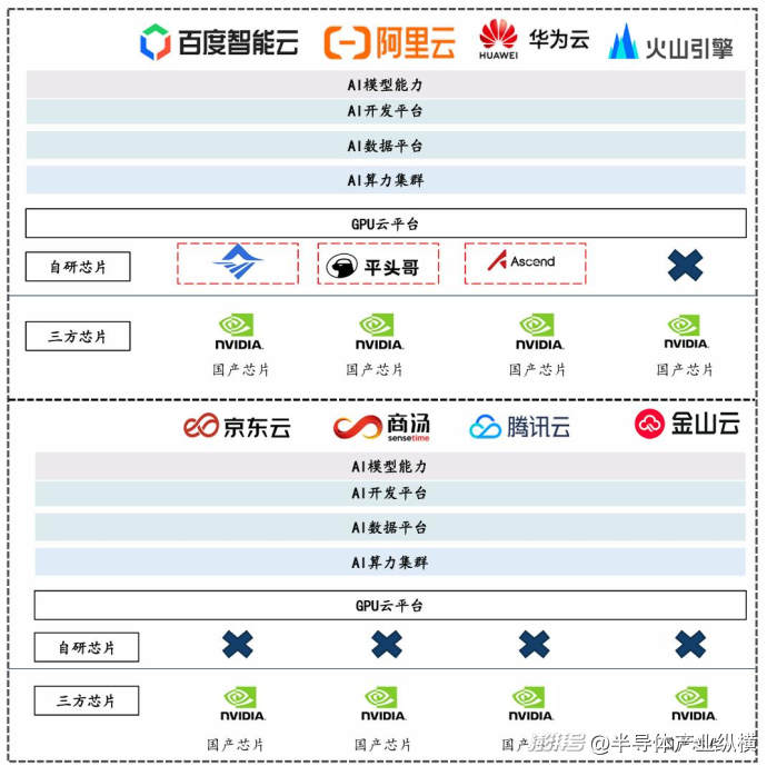 報告顯示,在中國GPU云計算領域,市場格局呈現(xiàn)出差異化:百度、華為及阿里憑借自研的昆侖芯、昇騰系列AI芯片及平頭哥芯片,逐步構建從硬件到云服務的垂直整合能力,減少了對外部供應商的依賴, 并在大模型訓練等方面展現(xiàn)出獨特優(yōu)勢。與此同時,騰訊云等其他主要云廠商則主要依賴英偉達的高端GPU產(chǎn)品來提供AI算力服務,在探索與部分國產(chǎn)GPU合作的同時,尚未實現(xiàn)大規(guī)模自研GPU的應用。