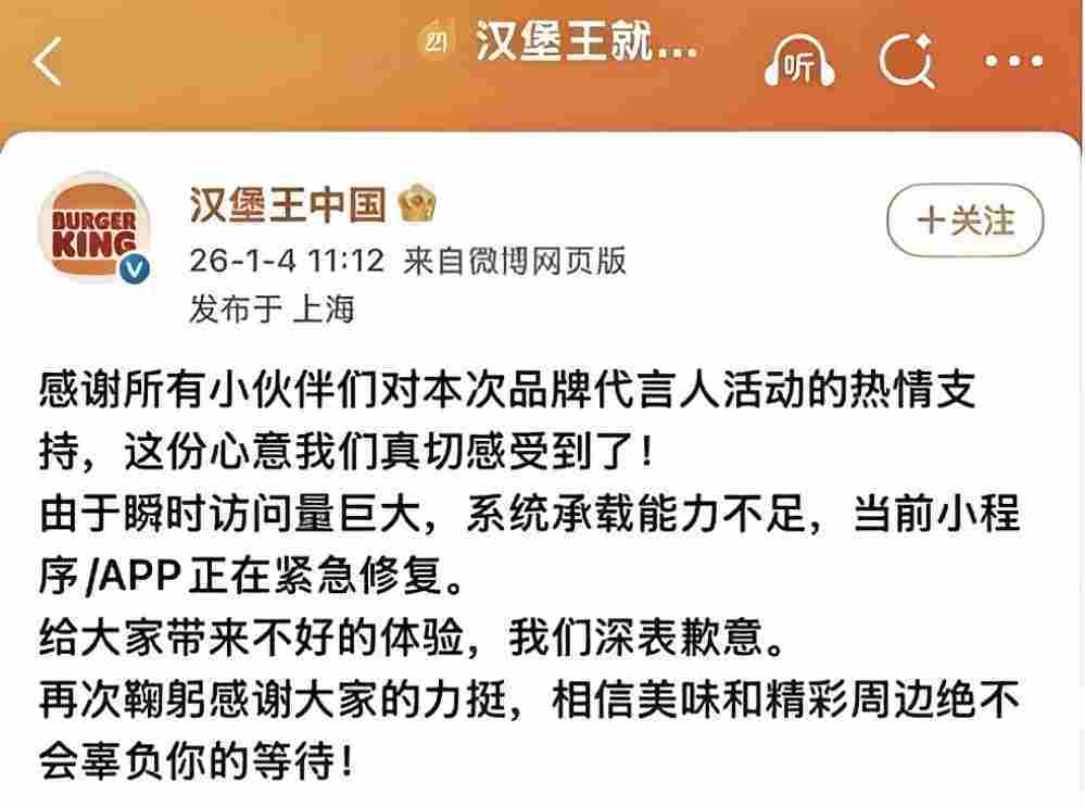 而在第二條致歉中,官方稱“由于系統(tǒng)故障,部分小伙伴未能如愿買(mǎi)到2026代言人元旦禮盒套餐,我們?nèi)f分歉意。我們也非常理解大家此刻的失落心情,但請(qǐng)放心,所有熱愛(ài)都不會(huì)被辜負(fù)。我們近期將在天貓漢堡王官方旗艦店開(kāi)放2026代言人元旦禮盒套餐(1月4日同款周邊)的預(yù)訂?!?/p>
