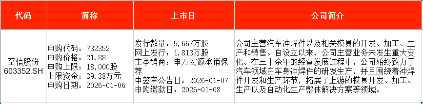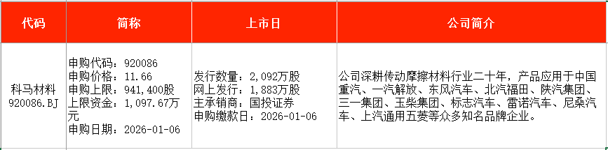 從時間表看,至信股份(603352)、科馬材料(920086)均將在本周二(1月6日)申購。