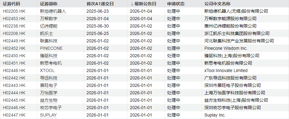 其中,萬幫數(shù)字能源股份有限公司、河北聯(lián)集科技產(chǎn)業(yè)發(fā)展股份有限公司、Pinecone Wisdom Inc.、臻驅(qū)科技(上海)股份有限公司、新思考電機(jī)股份有限公司、xTool Innovate Limited、廣東導(dǎo)遠(yuǎn)科技股份有限公司、深圳市景旺電子股份有限公司、上海萬怡醫(yī)學(xué)科技股份有限公司、益方生物科技(上海)股份有限公司、深圳宏芯宇電子股份有限公司、Suplay Inc.等12家公司為首次遞交。