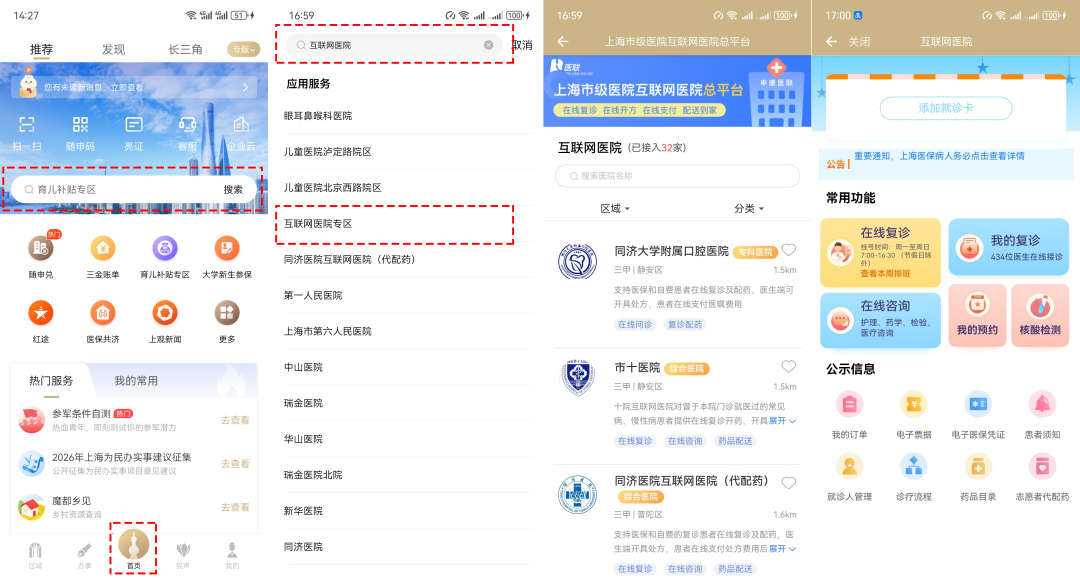 登錄“隨申辦市民云”APP→首頁搜索框,輸入關(guān)鍵字“互聯(lián)網(wǎng)醫(yī)院”→點(diǎn)擊“互聯(lián)網(wǎng)醫(yī)院專區(qū)”進(jìn)入服務(wù)頁面→選擇醫(yī)院→根據(jù)需求,點(diǎn)擊醫(yī)院提供的就醫(yī)服務(wù),即可在線完成等相關(guān)復(fù)診、配藥等操作。