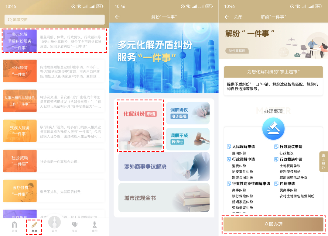 登錄“隨申辦市民云”APP→進(jìn)入“辦事”頻道→點(diǎn)擊“多元化解矛盾糾紛服務(wù)一件事”進(jìn)入服務(wù)頁面,根據(jù)辦事需求點(diǎn)擊并提交申請即可。