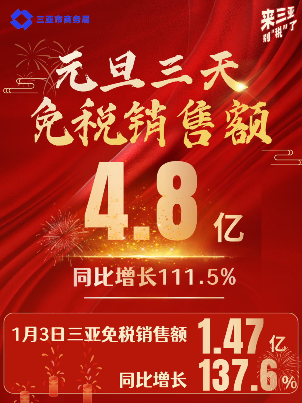 據(jù)三亞市商務(wù)局披露的數(shù)據(jù),元旦三天,三亞免稅銷售額4.8億元(人民幣,下同),同比增長(zhǎng)111.5%。其中1月1日三亞免稅銷售額1.63億元,同比增長(zhǎng)83.2%;1月2日三亞免稅銷售額1.71億元,同比增長(zhǎng)124.3%;1月3日三亞免稅銷售額1.47億元,同比增長(zhǎng)137.6%。