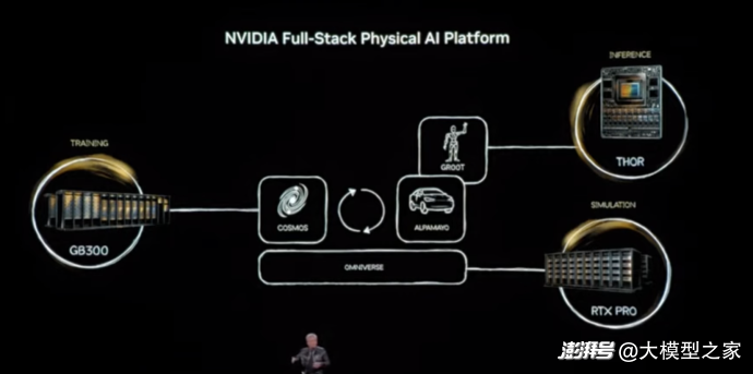 在演講中,黃仁勛重點(diǎn)介紹了NVIDIA Cosmos“世界基礎(chǔ)模型”,用于理解物理規(guī)律、生成物理一致的場(chǎng)景數(shù)據(jù),并在閉環(huán)中訓(xùn)練AI行動(dòng)能力。這不是一個(gè)簡(jiǎn)單的視頻生成模型,而是一個(gè)理解物理、重力、摩擦力和慣性的世界模型。它不僅能生成視頻,還能模擬物理反饋,解決AI在現(xiàn)實(shí)世界中因缺乏“常識(shí)”而產(chǎn)生的幻覺(jué)。這套體系并不只是服務(wù)于研究,而是直接指向自動(dòng)駕駛與機(jī)器人。