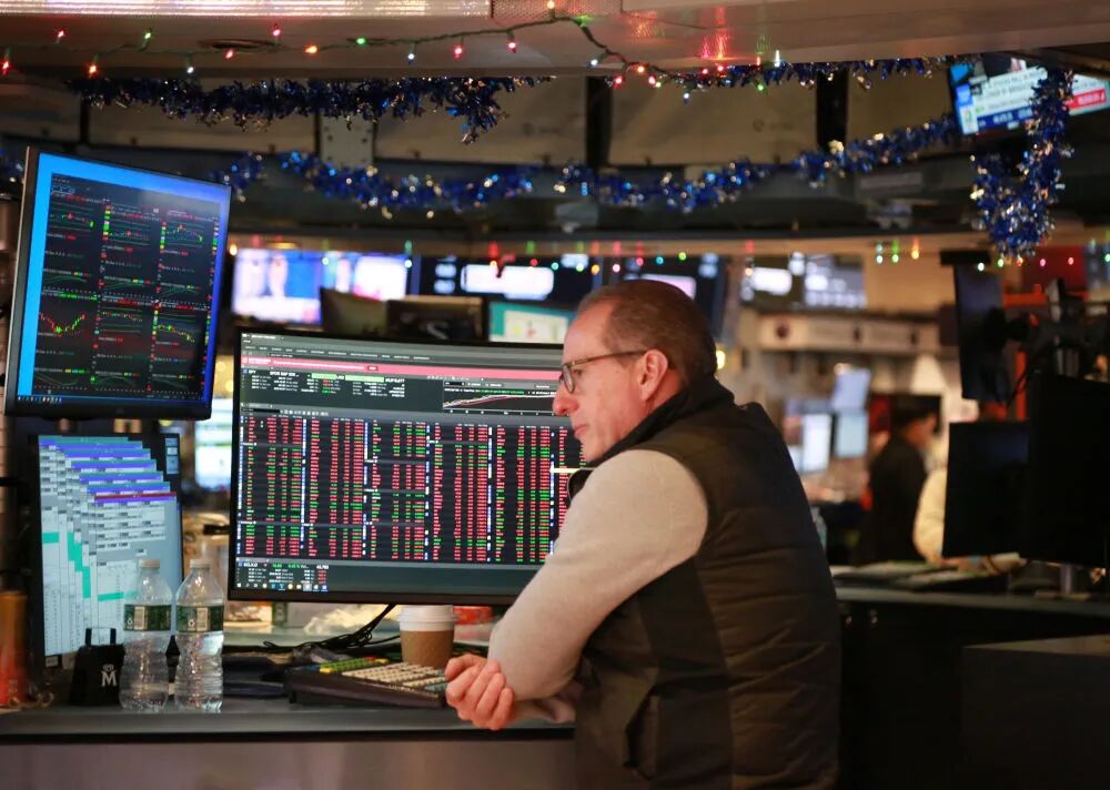 2025年12月12日,一名交易員在美國(guó)紐約證券交易所交易大廳內(nèi)工作。紐約股市三大股指當(dāng)日下跌。新華社記者 劉亞南 攝