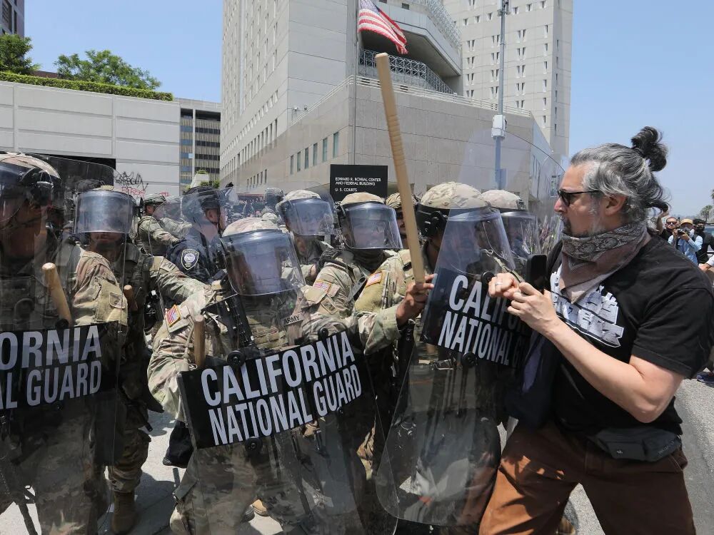 2025年6月8日,在美國(guó)加利福尼亞州洛杉磯市中心的聯(lián)邦執(zhí)法機(jī)構(gòu)門前,抗議者與國(guó)民警衛(wèi)隊(duì)人員發(fā)生沖突。新華社發(fā)(邱晨 攝)