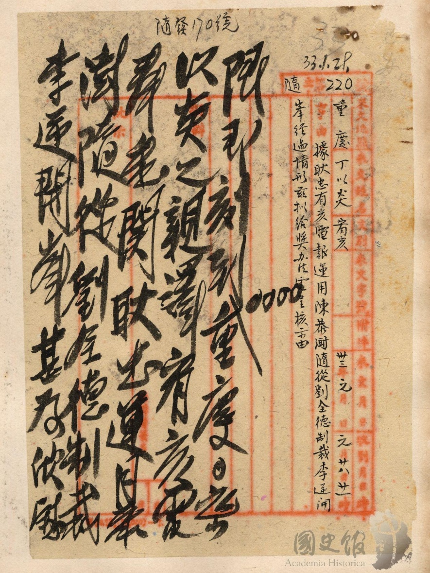 關(guān)耿忠運(yùn)用恭澍隨從劉全德制裁李逆開峰,甚為欣慰。應(yīng)發(fā)獎(jiǎng)金希立即如數(shù)照發(fā),并將李逆開峰自投偽后主持偽方密電偵譯,并將偵譯所得送交敵方危害中央之情形,與此次制裁李逆之經(jīng)過,由兄?jǐn)M稿詳呈委座為要。又此次耿忠運(yùn)用劉全德制裁李逆,恭澍是否得知?以及李逆死后,敵偽兩方面對此案動態(tài)如何?均希即電耿忠詳復(fù)。