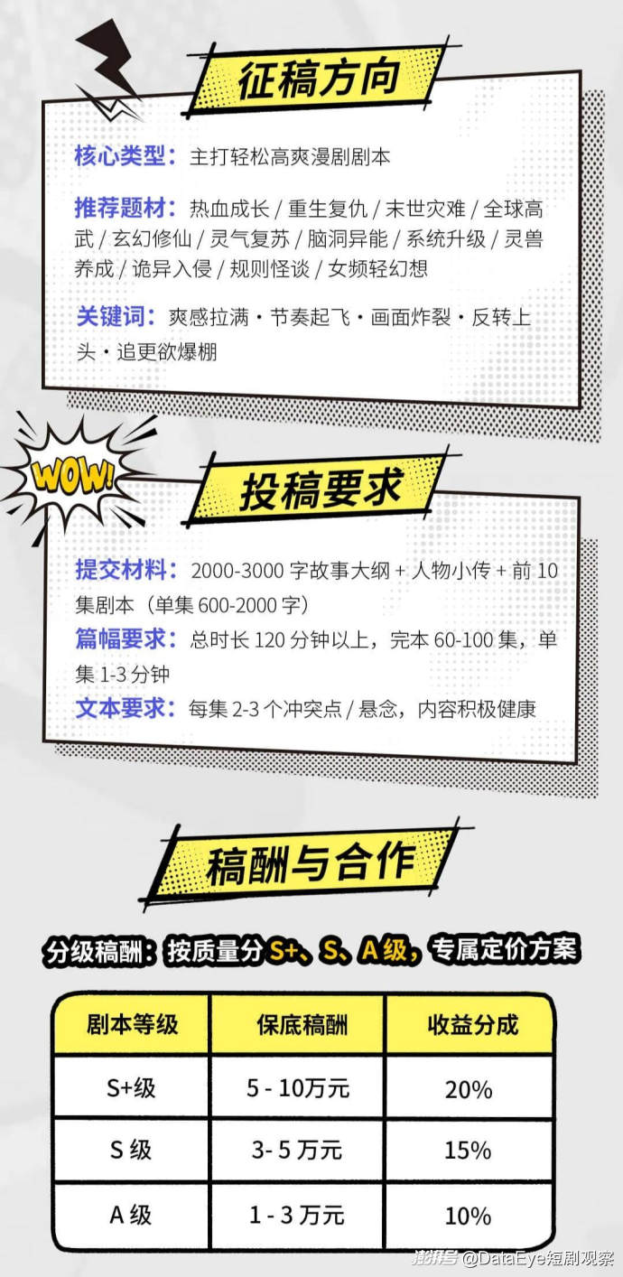 稿酬方面,七貓設(shè)置分級稿酬,S+級劇本保底稿酬5-10萬元,收益分成20%;S級劇本保底稿酬3-5萬元,收益分成15%;A級劇本保底稿酬1-3萬元,收益分成10%。