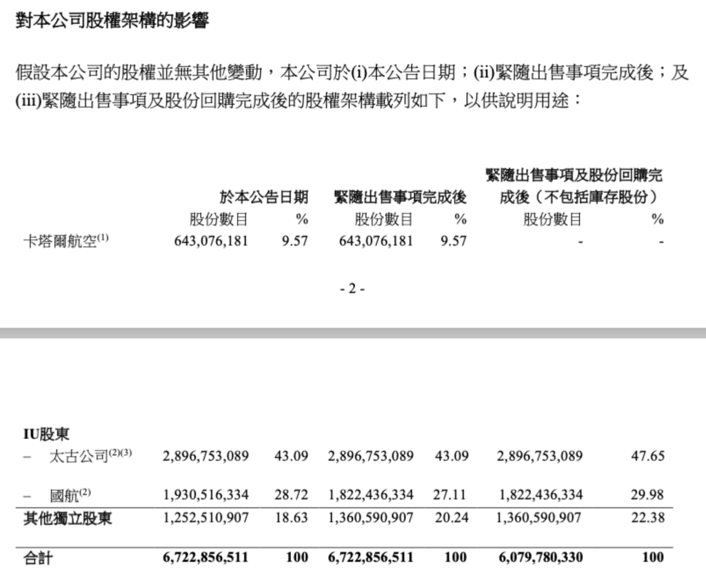 在出售事項(xiàng)及對(duì)卡塔爾所持股份回購(gòu)?fù)瓿珊螅僭O(shè)國(guó)泰航空已發(fā)行股份無其他變動(dòng),太古公司對(duì)國(guó)泰航空的持股比例將由本公告日期約43.09%增至約47.65%,繼續(xù)成為國(guó)泰航空的大股東。國(guó)航的持股比例將由約27.11%增至約29.98%。