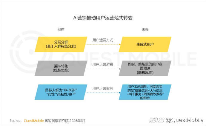 3.4 用戶角度:AI驅(qū)動(dòng)用戶運(yùn)營(yíng)范式,從分層分群(基于人群標(biāo)簽分發(fā))用戶運(yùn)營(yíng)方式逐漸過渡到生成式用戶經(jīng)營(yíng)