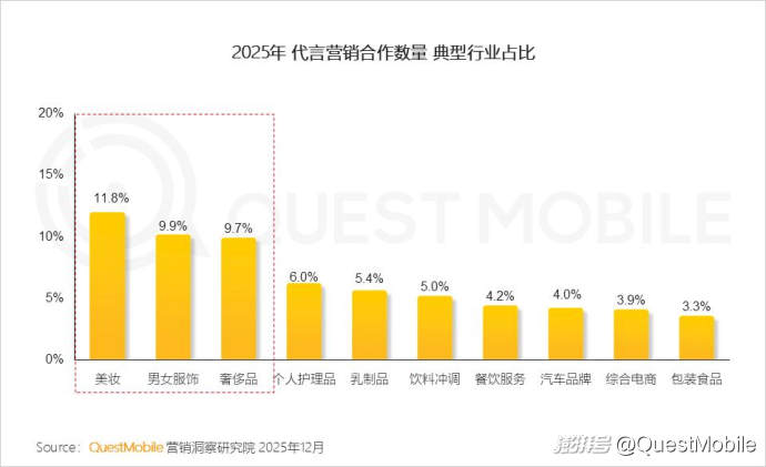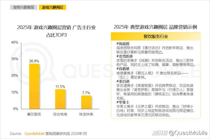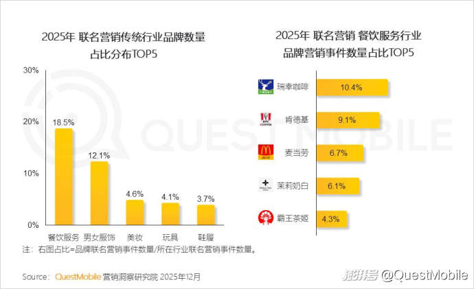 這種變化,也給餐飲服務(wù)、男女服飾等傳統(tǒng)行業(yè)帶來了更多鮮活商機(jī),整個(gè)2025年,這兩個(gè)行業(yè)聯(lián)名營(yíng)銷占比分別為18.5%、12.1%。具體到餐飲服務(wù)行業(yè)中,瑞幸咖啡、肯德基、麥當(dāng)勞、茉莉奶白、霸王茶姬位居top 5,占比分別為10.4%、9.1%、6.7%、6.1%、4.3%。