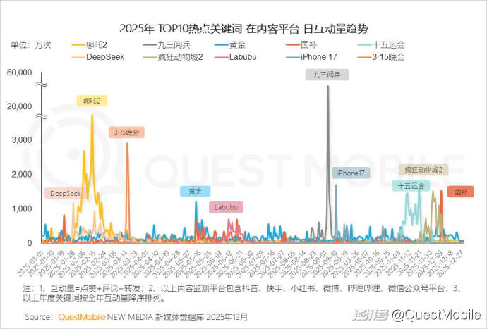 今天給大家盤點(diǎn)一下2025年?duì)I銷熱點(diǎn)事件。QuestMobile數(shù)據(jù)顯示,2025年可謂是營(yíng)銷“豐收年”,“情緒”成為核心生產(chǎn)力,用戶情緒不僅決定了諸多行業(yè)和產(chǎn)品走向(例如labubu的爆火),還構(gòu)建起了融合“品牌心智占領(lǐng)”、“營(yíng)銷爆點(diǎn)頻出”與“爆款產(chǎn)品銷售”于一體的閉環(huán)體系。