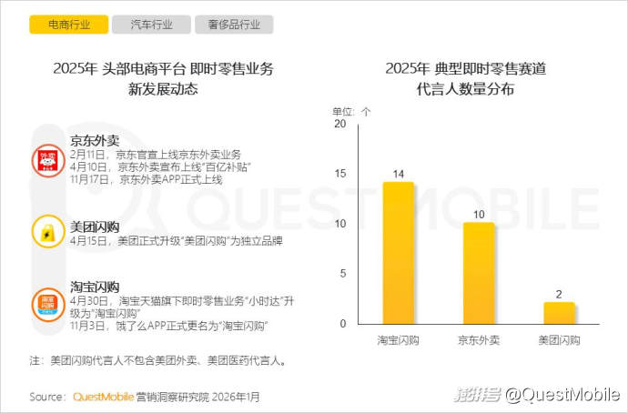 2.2 新業(yè)務(wù)或新發(fā)展戰(zhàn)略催生品牌競(jìng)爭(zhēng),營(yíng)銷側(cè)品牌爭(zhēng)相官宣代言人,如頭部電商平臺(tái)持續(xù)加碼即時(shí)零售賽道,其代言人數(shù)量增加