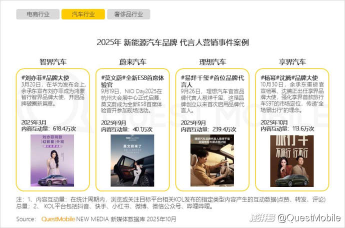 2.4 消費(fèi)市場(chǎng)環(huán)境變化,驅(qū)動(dòng)品牌代言營(yíng)銷策略轉(zhuǎn)變,新能源汽車代言人由“車主代言”轉(zhuǎn)向“藝人代言”