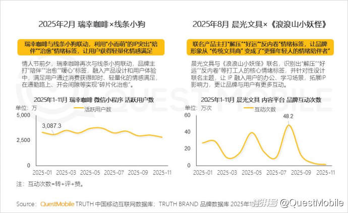 這當(dāng)中,“情緒”這個(gè)驅(qū)動(dòng)力讓聯(lián)名營(yíng)銷、IP營(yíng)銷迎來了新的升級(jí),品牌通過深度發(fā)掘IP與消費(fèi)者內(nèi)心“小情緒”的契合點(diǎn),內(nèi)化出深層情感標(biāo)簽,增強(qiáng)情感連接,用差異化的方式占領(lǐng)用戶心智,例如“瑞幸咖啡X線條小狗”的“治愈”、“晨光文具X《浪浪山小妖怪》”的“反內(nèi)卷”,都是如此。