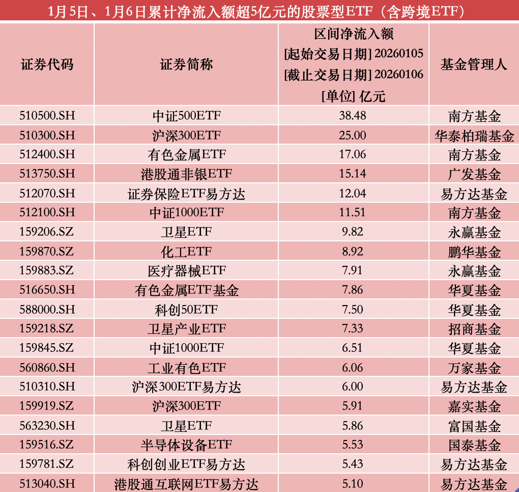從資金的整體流向來看,寬基ETF仍是吸金主力。1月5日至6日期間,南方中證500ETF、華泰柏瑞滬深300ETF的兩日凈流入額分別為38.48億元、25億元;南方中證1000ETF的累計凈流入額也在10億元以上,達(dá)11.51億元。