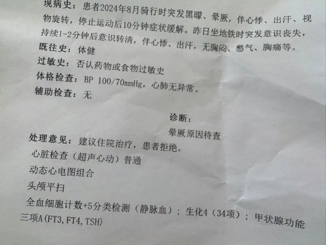 24年8月,王大可在北京的馬路上騎自行車,突然感覺眼前一黑,心跳加速,馬上就要癱在地上。她趕緊把車停在路邊,試圖大口喘氣讓自己平復下來。眼皮卻越來越沉,看著路口倒計時的紅綠燈,王大可有一瞬間以為是自己的生命倒計時。幾秒后,她失去了意識。