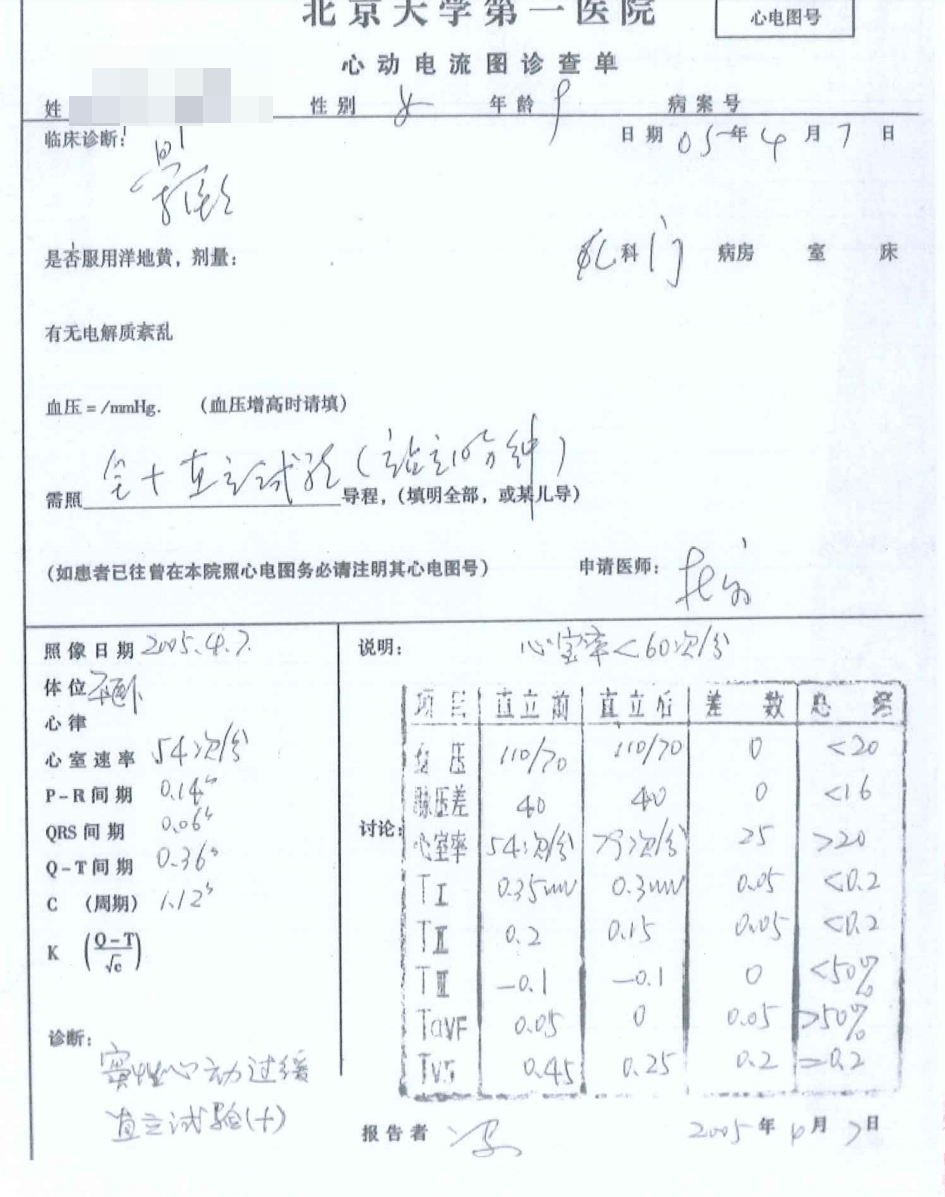 2005年4月,8歲的錢多多被爸爸帶去北京大學第一醫(yī)院,兒科醫(yī)生推測錢多多是血管迷走性暈厥,讓她住院一周做檢查。除了血常規(guī)、尿常規(guī)和心電圖,還要監(jiān)測睡眠期間的腦電波,排除有沒有大腦病灶和癲癇。最終要通過一個名叫直立傾斜測試的檢查,進行明確診斷,辨別是心臟抑制型、血管抑制型還是混合型(即兩種都有)。