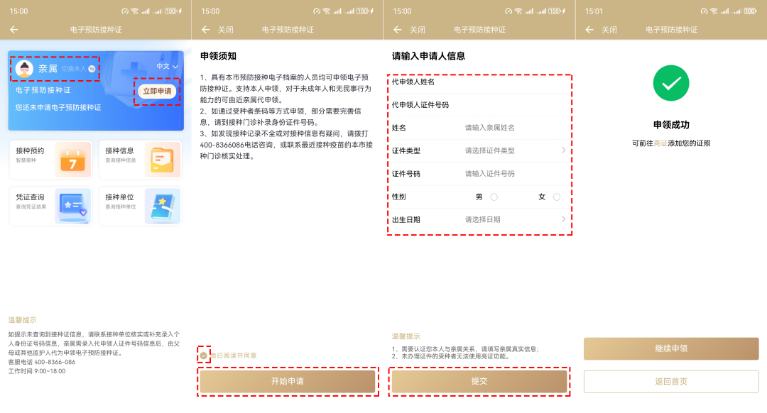 如需代為申領(lǐng),請選擇“切換親屬”頁面→點擊“開始申請”按鈕→根據(jù)提示完善基本信息并點擊“提交”后,方可獲取電子預(yù)防接種證。