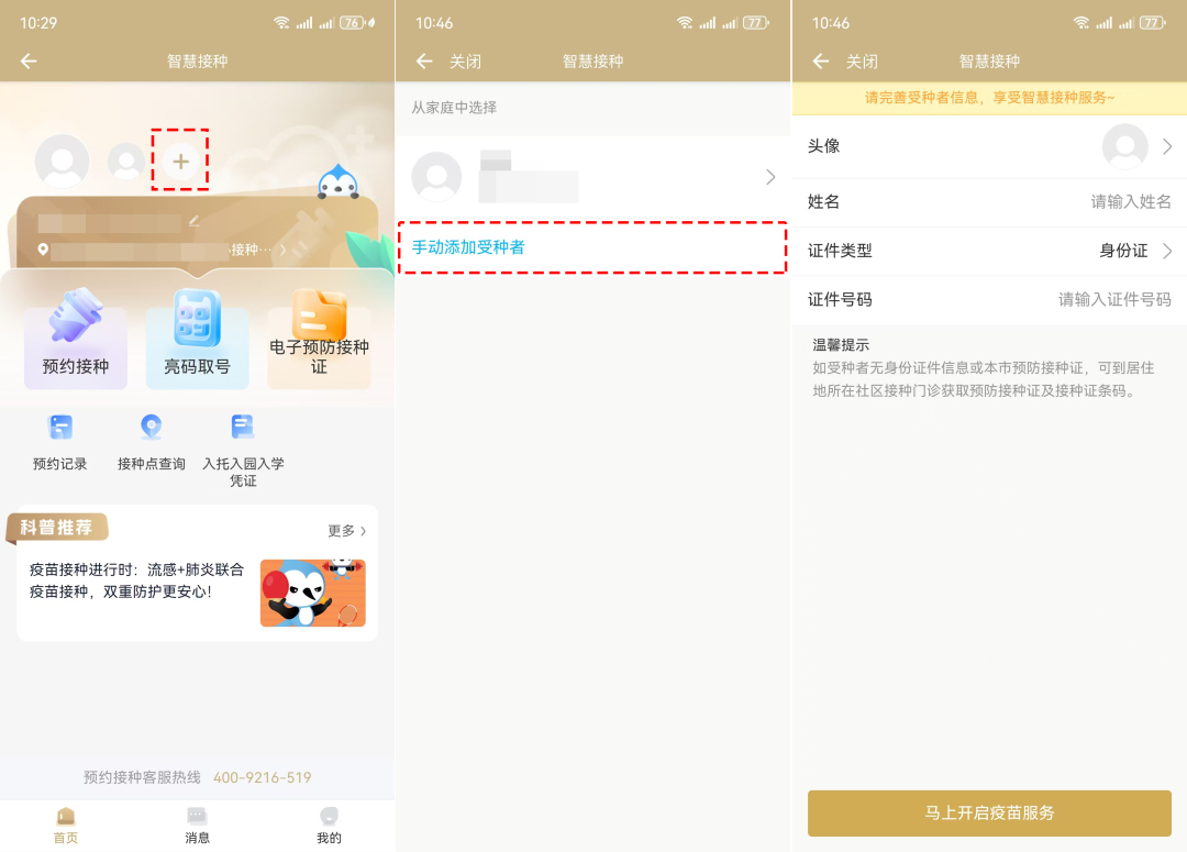 2、點擊頁面右上方的“⊕”→點擊“手動添加受種者”→填寫受種者個人信息,完成綁定受種人;