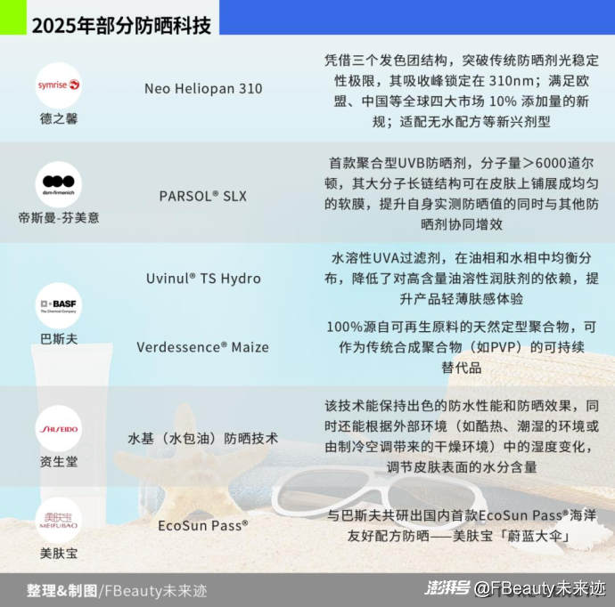 從產(chǎn)業(yè)鏈上游看,防曬產(chǎn)品的膚感、成膜性和環(huán)境友好依舊是這一品類開發(fā)的基本功,而巴斯夫、德之馨、帝斯曼等防曬劑開發(fā)商去年推出的核心技術正是瞄準這一方向。
