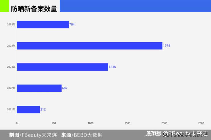從產(chǎn)品備案數(shù)據(jù)來看,2021年至今,市場上防曬產(chǎn)品總備案數(shù)量4835個,當前有效備案數(shù)量為4516個,整個2025年防曬新增備案近704個(注:防曬產(chǎn)品特證備案有效期為5年,已有產(chǎn)品迭代可更新備案,不用重新注冊)。這意味著,自2021年防曬特證管理以來,去年是市場上防曬產(chǎn)品最豐富的一年。