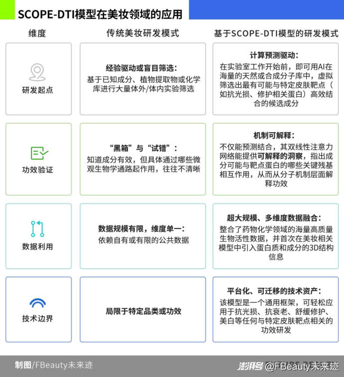 2025年末,MISTINE蜜絲婷SCOPE-DTI的人工智能大模型登上了國際頂級學術期刊《Nature Communications》。該模型基于13個國際權威數(shù)據(jù)庫構建,通過模擬蛋白質與小分子的三維結構,并采用雙線性注意力網(wǎng)絡等先進算法,實現(xiàn)了對“成分-靶點”相互作用的高精度、高通量預測。讓抗光損、舒緩修護等復雜功效的驗證從“黑箱”走向“白盒”。