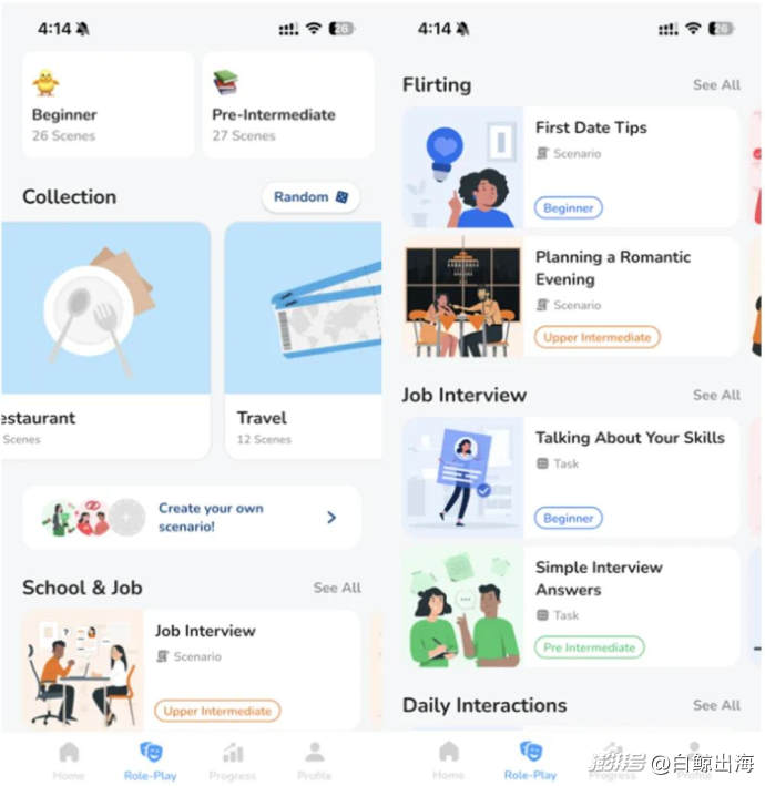 進(jìn)入產(chǎn)品后,用戶可以選擇按照系統(tǒng)給出的學(xué)習(xí)安排逐日推進(jìn),或者自主選擇場景進(jìn)行練習(xí)。在 Roleplay 頁面展示的是 13 大主題場景:餐廳、旅行、學(xué)校&工作、購物、面試、日?;?、社交、調(diào)情、美國生活等等。各場景下又分了 10 多個小話題,場景難度從 Beginner 到 Upper Intermediate 分級,覆蓋了從常規(guī)的餐廳投訴、銀行開戶到復(fù)雜的組織籌款活動、主持在線工作坊等不同場景。有趣的是,除了這些實(shí)用場景,「Learna」也兼顧到了“調(diào)情”和用戶理解“美國生活”的需求,比如怎么自然夸人、怎么進(jìn)行 Small Talk,說明產(chǎn)品團(tuán)隊(duì)對移民的需求理解不僅僅停留在 “生存”,還延伸到了 “融入”。