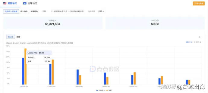「Learna」近期在美國快速爬榜,一度來到美國 iOS 教育暢銷榜 Top2,僅次于國民級教育 App「多鄰國」。點(diǎn)點(diǎn)數(shù)據(jù)顯示,「Learna」的單月流水已經(jīng)來到 170 萬美元,Sensor Tower 抓取到的雙端月流水更是高達(dá) 260 萬美元,接近躋身品類第一梯隊(duì),更加耐人尋味的是這款產(chǎn)品的營收分布,作為一款以教授“英文口語”為特色的產(chǎn)品,其超過 7 成的收入竟然來自美國本土。(作為對比,頭部的 AI 語言學(xué)習(xí)產(chǎn)品 Speak 的第一大收入市場是韓國。)