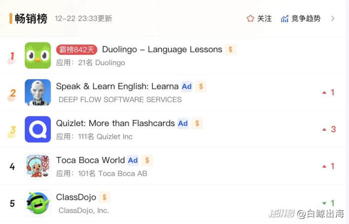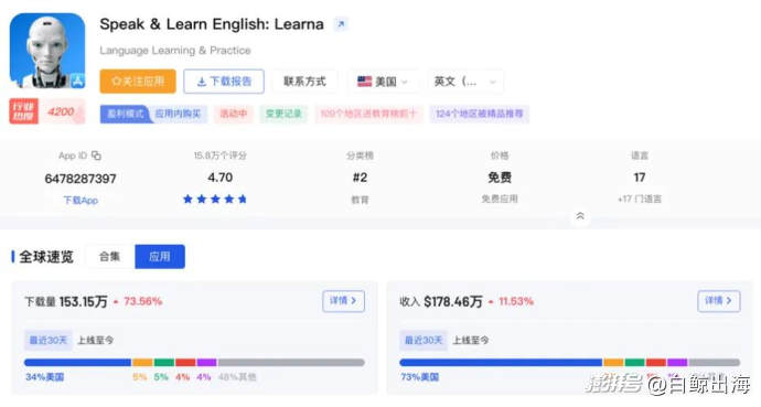 在白鯨出海發(fā)布的“AI 教育榜單”中,曾長期收錄一款名叫「Learna」的 AI 語言產(chǎn)品。年初這款產(chǎn)品還沒有引起我們的注意,因?yàn)闊o論是產(chǎn)品功能,還是月活用戶、內(nèi)購收入等維度,「Learna」的表現(xiàn)只能稱上“中規(guī)中矩”。