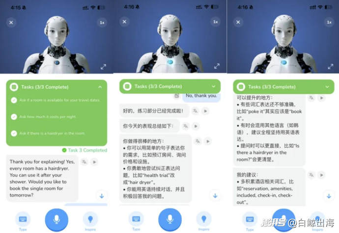 核心交互是 AI 角色扮演對話,比如選擇“酒店預(yù)訂”話題后,AI 扮演前臺,用戶扮演顧客,語音輸入進(jìn)行真實(shí)對話。用戶需要完成給定的 3 個話題任務(wù),比如詢問有沒有空房間、咨詢價格以及詢問房間里是否有吹風(fēng)機(jī),AI 會實(shí)時識別語音,并在全部任務(wù)完成后給出肯定、不足、建議三個層面的反饋,這種“交流→糾錯→改進(jìn)”的快速迭代,正是口語提升的核心路徑。