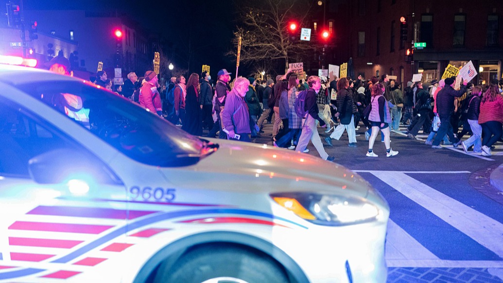 當(dāng)?shù)貢r間2026年1月8日,美國華盛頓,示威者游行至白宮,抗議移民和海關(guān)執(zhí)法局(ICE)的執(zhí)法人員在明尼阿波利斯槍殺了蕾恩·妮科爾·古德。視覺中國 圖