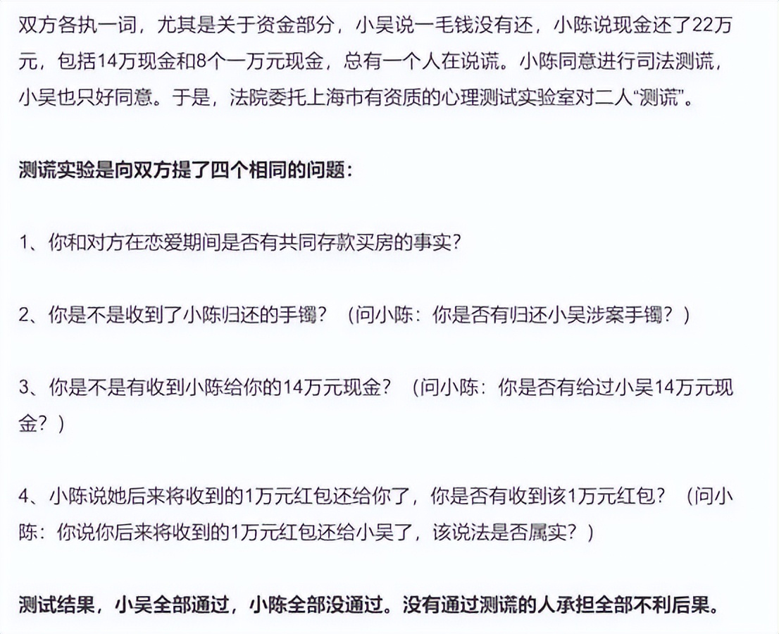 最近,一則關(guān)于婚戀財(cái)產(chǎn)糾紛“測(cè)謊翻案”的新聞引發(fā)關(guān)注。上海一對(duì)情侶因婚前財(cái)產(chǎn)糾紛對(duì)簿公堂,女方小陳將共同賬戶中的57萬(wàn)元轉(zhuǎn)入母親名下后不辭而別,男方小吳訴至法院,要求其歸還購(gòu)房款、租金、金鐲折價(jià)款及訂婚禮金等共計(jì)約38萬(wàn)元。面對(duì)爭(zhēng)議焦點(diǎn)——女方稱已歸還,男方稱未歸還,雙方各執(zhí)一詞,證據(jù)難辨。最終,法院委托司法心理測(cè)試實(shí)驗(yàn)室進(jìn)行測(cè)謊實(shí)驗(yàn),結(jié)果顯示:男方小吳所有問(wèn)題均通過(guò)測(cè)試,而女方小陳則全部未通過(guò)。法院據(jù)此認(rèn)定其應(yīng)承擔(dān)不利后果,并判決其償還30萬(wàn)元及6000元測(cè)謊費(fèi)用。