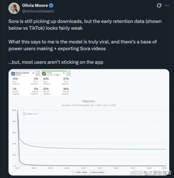 從上線初期SoraApp的火爆程度來看,AI分身、AI客串、AI混剪等玩法,吸引了很多早已躍躍欲試的嘗鮮用戶,上線四天即登頂美國區(qū)AppStore免費(fèi)應(yīng)用榜。然而,12月初a16z合伙人Olivia Moore分享的一組數(shù)據(jù),卻給OpenAI潑了一盆冷水。數(shù)據(jù)顯示,上線以來Sora App的用戶留存率直線下滑,90%的用戶一天即走,98%的用戶沒有堅(jiān)持過一周,兩個(gè)月后,第一批涌入的用戶已經(jīng)悉數(shù)離開。