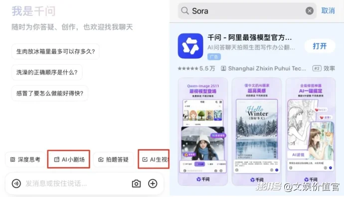 值得一提的是,千問將“AI小劇場”“AI生視頻”放在了首頁最醒目的入口位置,甚至還在AppStore購買了“Sora”的關(guān)鍵詞廣告位,顯然是希望通過新奇的娛樂體驗(yàn),帶動一波用戶增長,與豆包形成足夠的差異化。豆包雖然也有AI視頻板塊并支持用戶“做同款”,但并不支持用戶以AI分身“親自”開演,目前僅支持基于靜態(tài)照片的AI寫真。