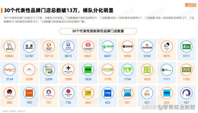 截至2025年,全國(不含港澳臺)現(xiàn)制茶飲門店總量已突破41.5萬家,全國30個代表性現(xiàn)制茶飲品牌門店總量已突破13.1萬家。頭部品牌“巨無霸”效應(yīng)顯著,蜜雪冰城以4.38萬家門店穩(wěn)居首位,古茗1.2萬家位列第二,霸王茶姬以1.01萬家屈居第三。