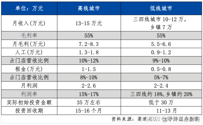 當(dāng)門店平均月利潤只有1萬的時候,高線城市月收入不到9萬,低線城市不到5萬,整體投資回收期約為3年,是單店模型惡化的轉(zhuǎn)折點,自此行業(yè)增速將大幅放緩甚至回落。
