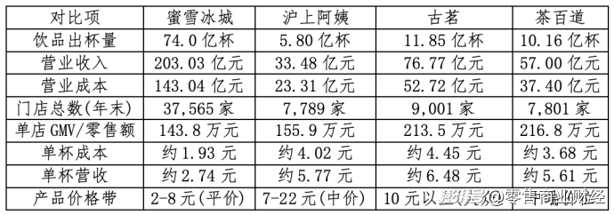 單杯營收=上市公司總收入/總出杯量,這相當(dāng)于品牌運營方賣給加盟商一杯飲料的“批發(fā)價”。單杯成本=上市公司總銷售成本/總出杯量,這相當(dāng)于這杯飲料的“原材料成本”。