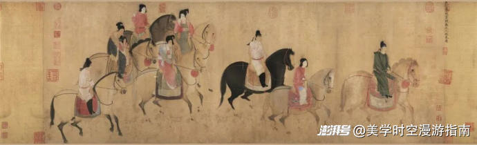 《虢國(guó)夫人游春圖》展現(xiàn)了楊貴妃的姐姐虢國(guó)夫人與一眾仕女、隨從游春的場(chǎng)景。人物行列錯(cuò)落有致,馬匹步伐舒緩,空間關(guān)系自如克制。是一種高度成熟的秩序感與從容感??串?huà) | 虢國(guó)夫人真的是中式審美頂流啊