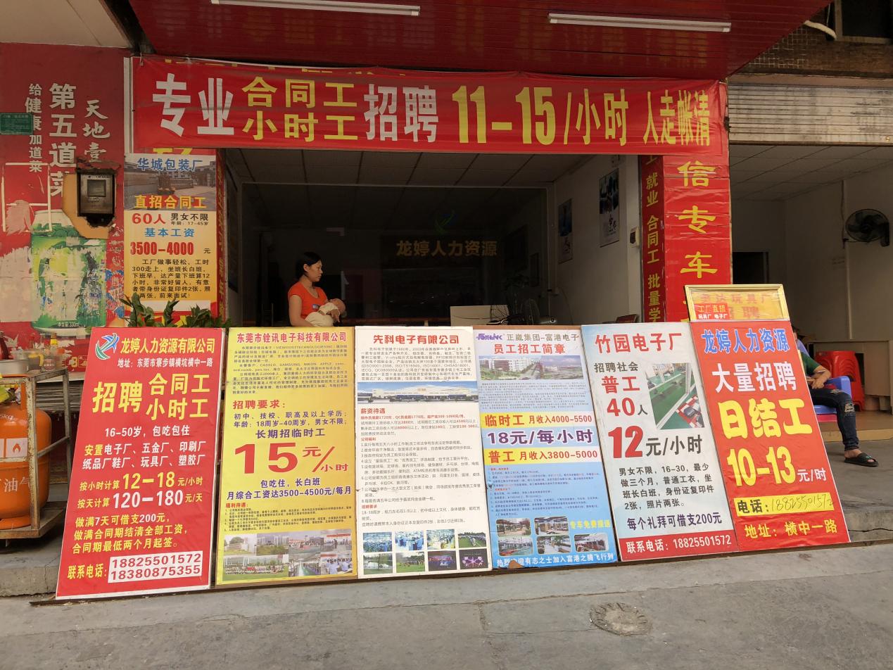 東莞街邊大量關(guān)于臨時(shí)工的招聘。(拍攝:李一凡)