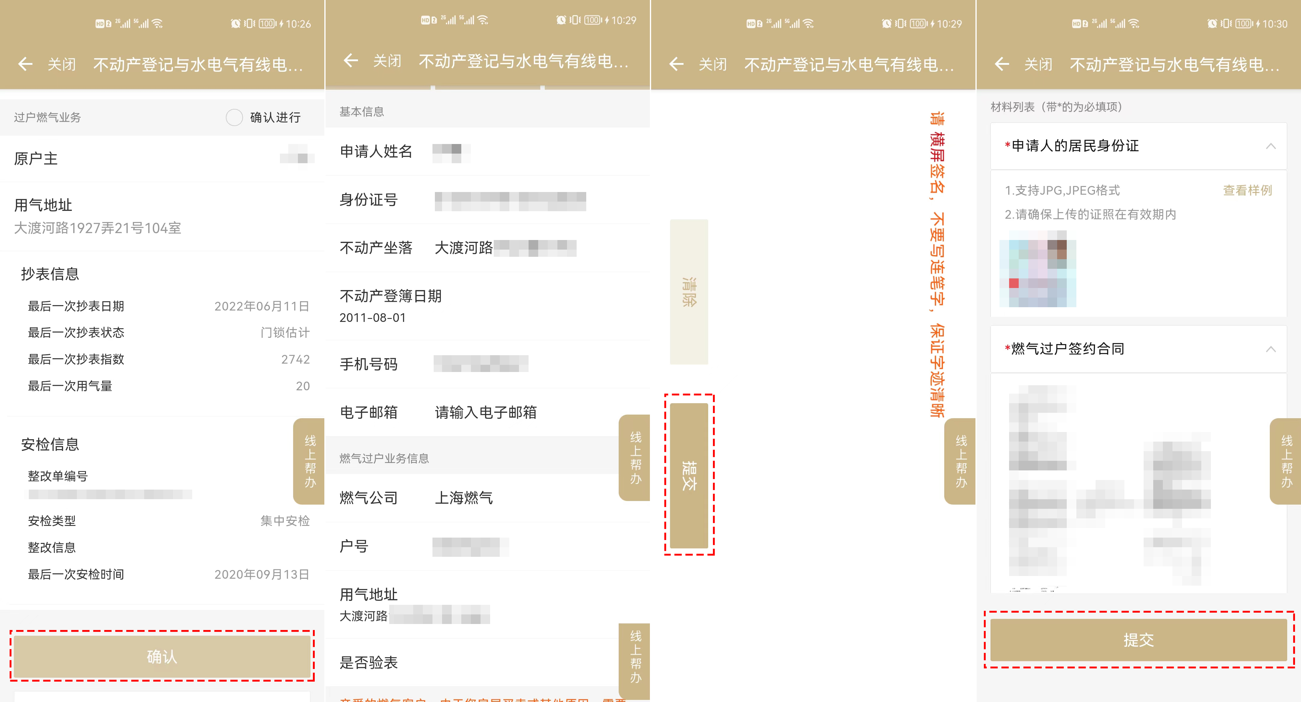 4、進(jìn)入信息驗證頁面→確認(rèn)申請人信息(姓名、身份證號碼、手機(jī)號碼等)→手寫簽名→確認(rèn)申請人信息(身份證)和過戶業(yè)務(wù)合同→提交后,等待審核處理即可;