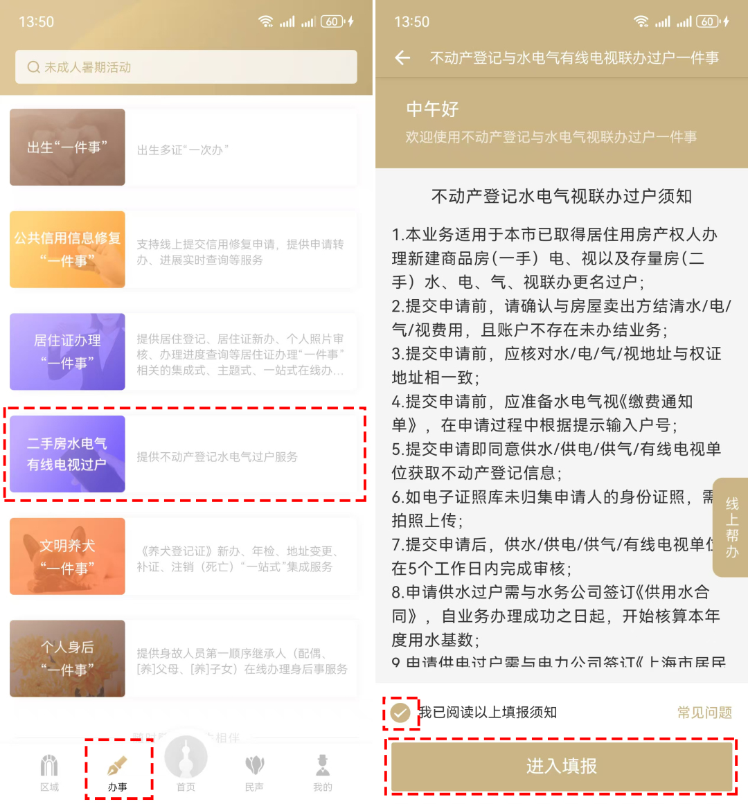 手機(jī)登錄“隨申辦市民云”APP,通過“二手房水電氣有線電視過戶”一件事服務(wù),就能在線完成過戶操作。