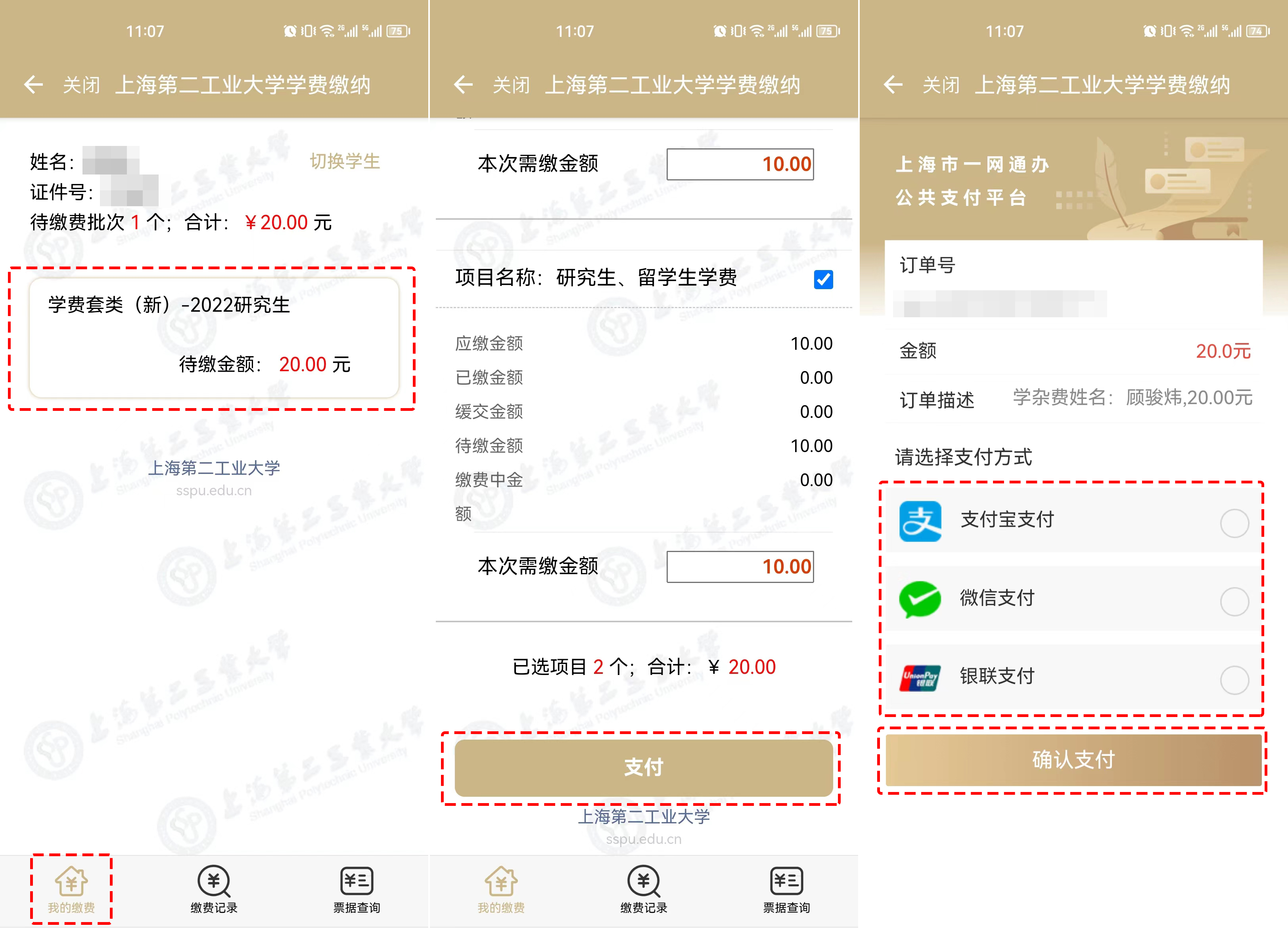 確認(rèn)金額無誤后,點擊“支付”按鈕,進(jìn)行線上支付。