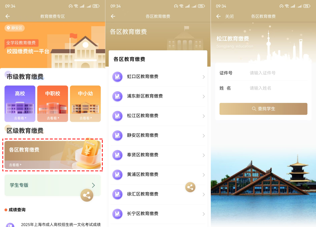 點擊“各區(qū)教育繳費”→選擇就讀學(xué)校所在區(qū),進(jìn)入對應(yīng)繳費平臺。目前已支持松江、黃浦、徐匯、長寧、虹口、奉賢區(qū)等統(tǒng)一在線繳費。