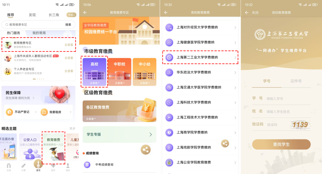 登錄“隨申辦市民云”APP→點擊“熱門服務(wù)”-“教育繳費專區(qū)”或“精選主題”-“教育繳費”→點擊“高?!薄业讲Ⅻc擊“上海第二工業(yè)大學(xué)”→輸入學(xué)號、姓名、驗證碼,點擊“查找學(xué)生”進(jìn)入繳費頁面;